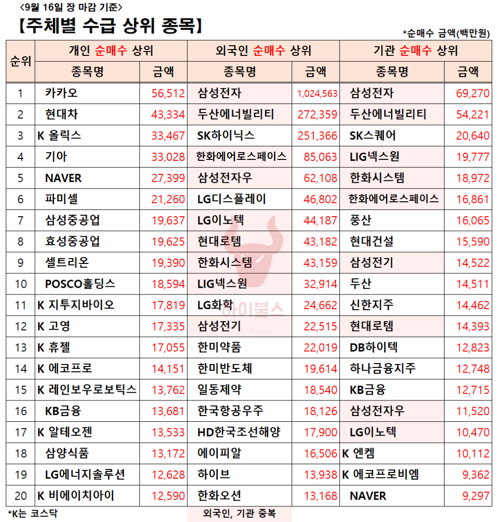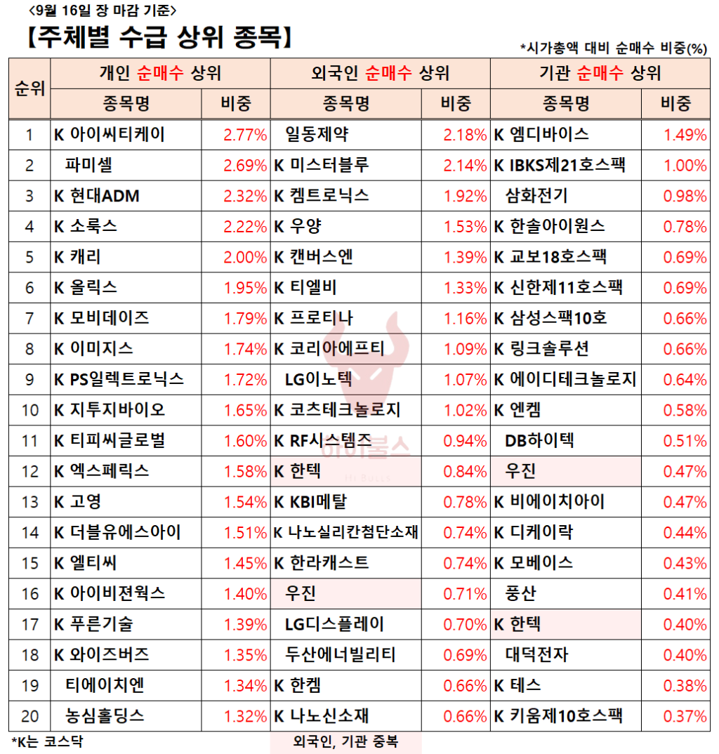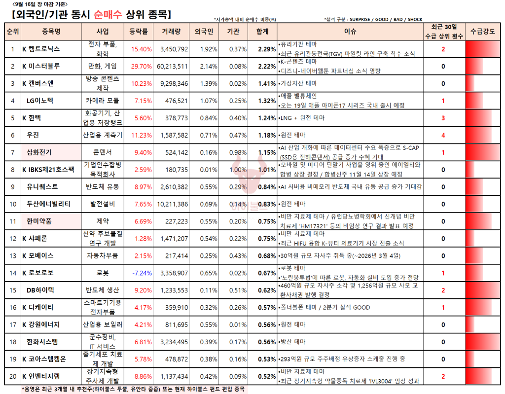 [09.16] 외국인/기관 순매수 상위 종목(반도체, 방위산업)