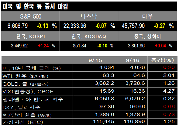 9월 16일(현지시간) 뉴욕증시는 금리결정 대기 속 경계 심리, 소매판매(8월 +0.6%)가 견조했지만 금리 인하 폭을 가늠하려는 관망이 우세하였고, 연준 25bp 인하 기대는 유지되나, 전일 사상최고 랠리 이후 이벤트 앞 조정/숨고르기 양상