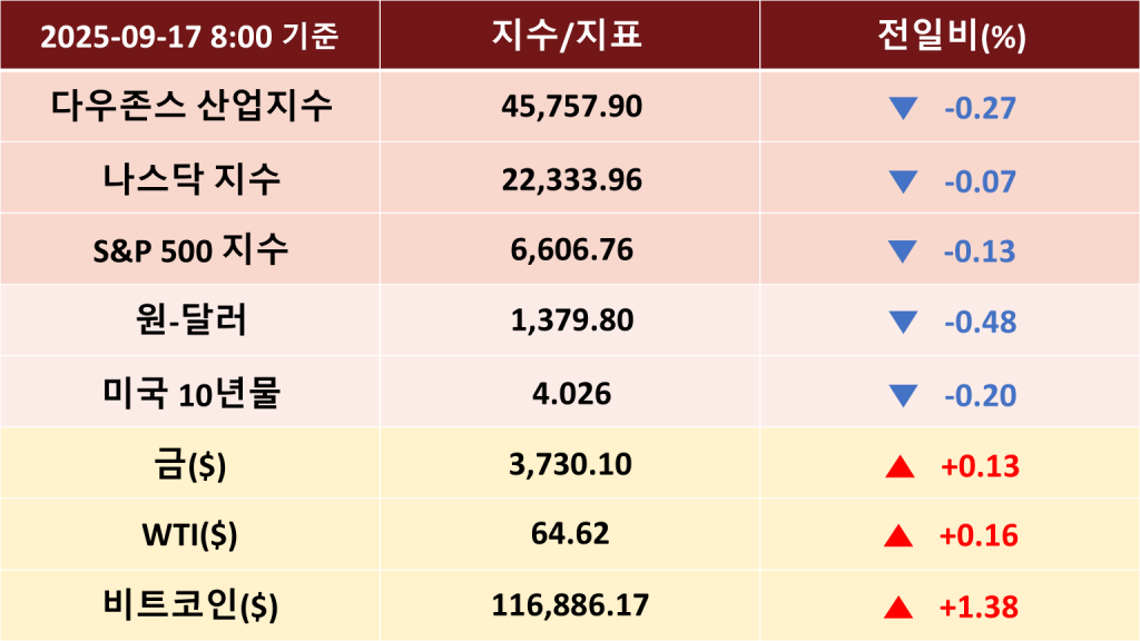 [뉴욕마감시황, 9/17 수 ] “금리 인하를 기다리는 밤. 지수는 숨 고르고, 금은 사상최고권에서 빛난다; 내일 점도표가 모든 답을 바꿀 수 있다.”