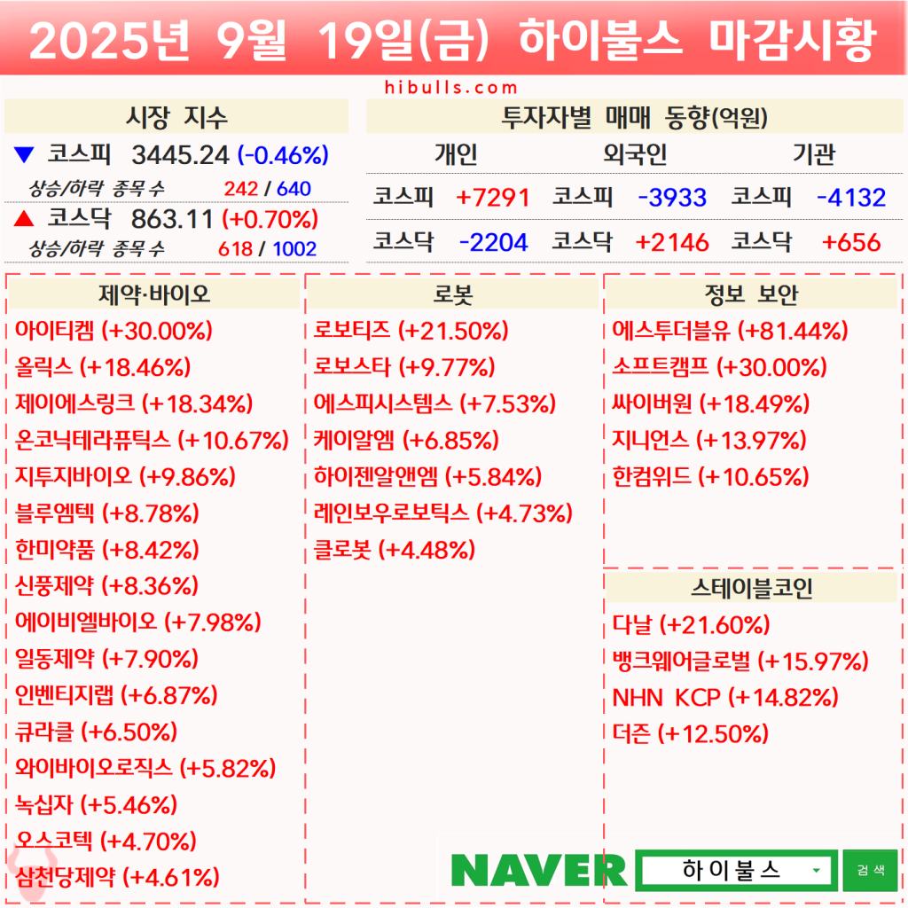 [09.19] 증시 마감시황 및 오늘의 특징주/특징섹터