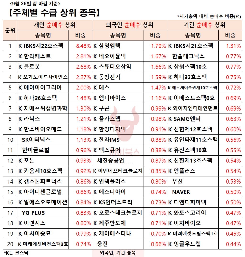 [09.26] 외국인/기관 순매수 상위 종목(반도체, K특산물)