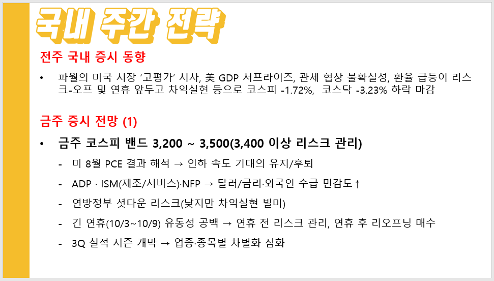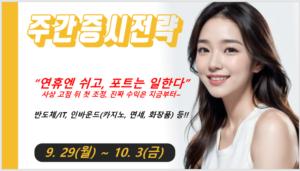 [주간증시전략] “연휴엔 쉬고, 포트는 일한다” 사상 고점 뒤 첫 조정, 진짜 수익은 지금부터~반도체/IT, 인바운드(호텔, 카지노, 화장품) 등! 9/29(월)~10/3(금)