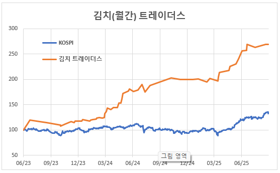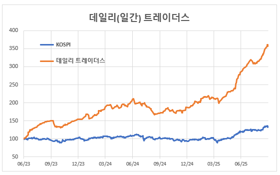 한경유레카에서 서비스하고 있는 친절한 미정씨의 데일리/직장인/김치 트레이더스를 지난 2.25년 운용하는 동안 누적수익률 세금, 수수료 공제 후 각각 202.6%, 179.0%, 162.2% 기록. 동기간 KOSPI 수익률은 34.4% 대비 엄청난 초과 수익를 달성