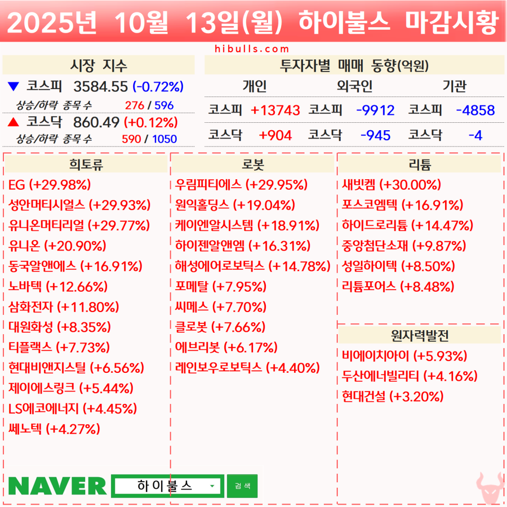 [10.13] 증시 마감시황 및 오늘의 특징주/특징섹터