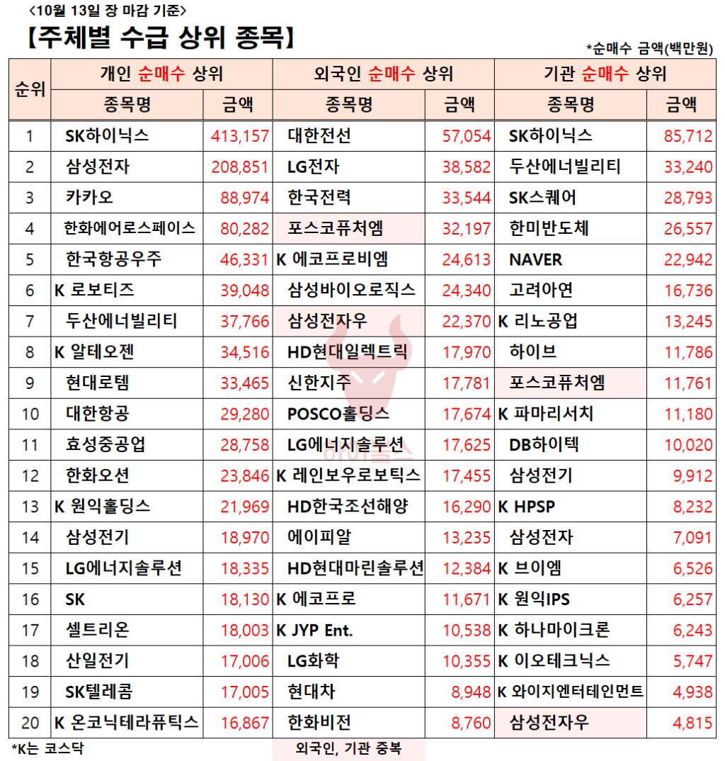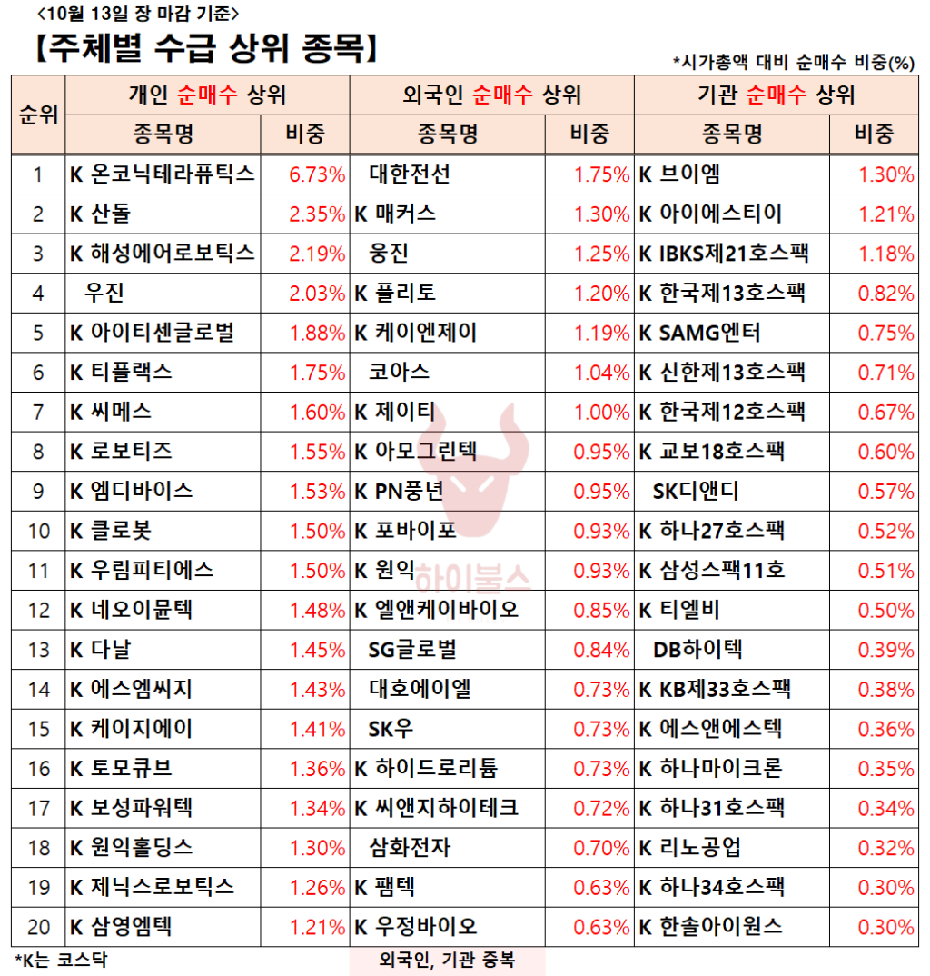 [10.10] 외국인/기관 순매수 상위 종목(AI 랠리)
