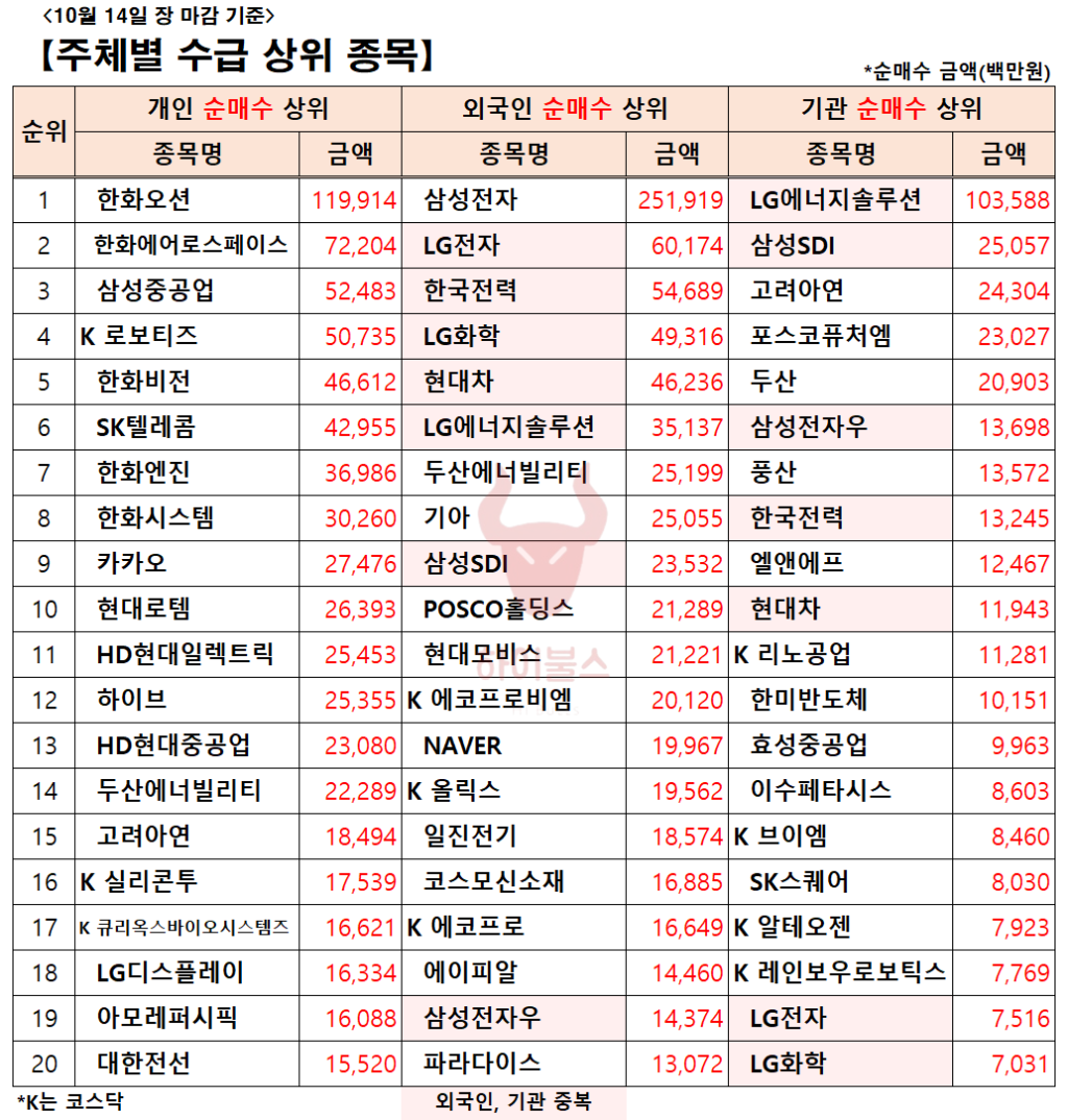 [10.10] 외국인/기관 순매수 상위 종목(AI 랠리)