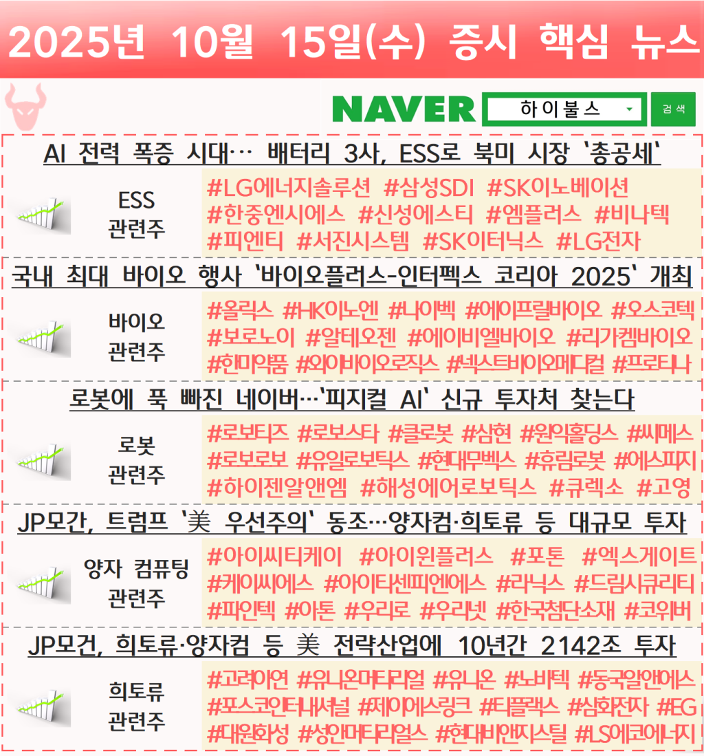 [10.15] 증시 개장 전 핵심뉴스 하이불스 Pick