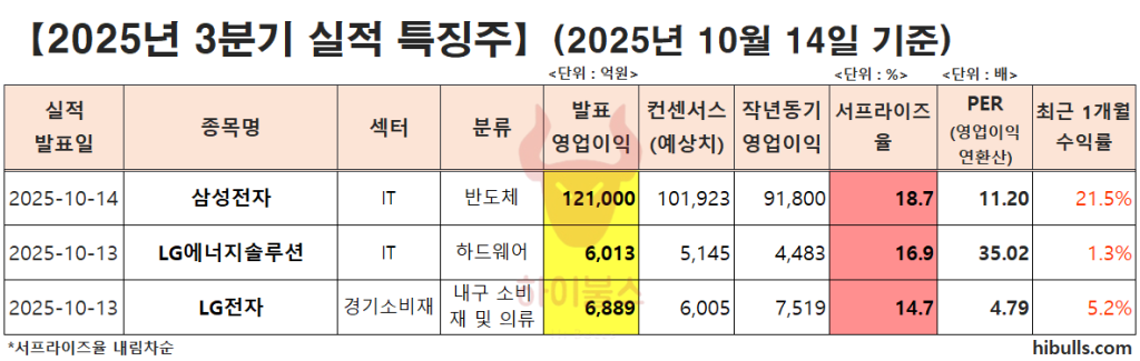 2025년 3분기 실적 특징주(10월 14일 기준)