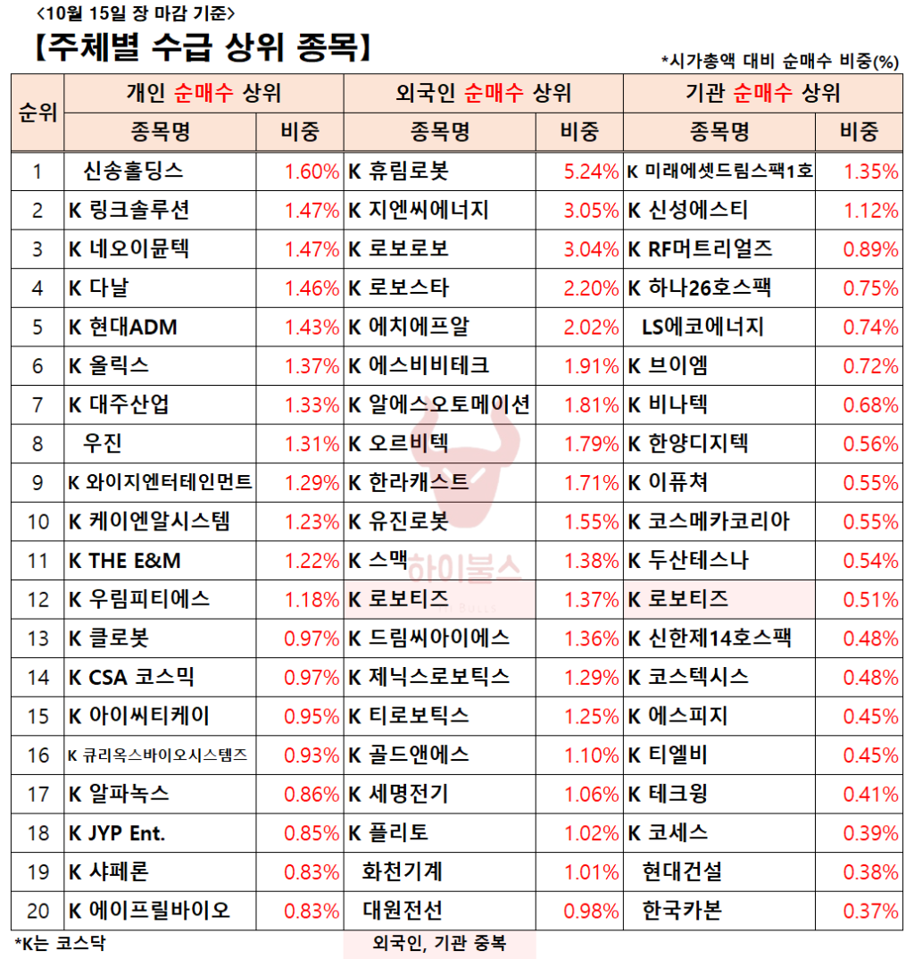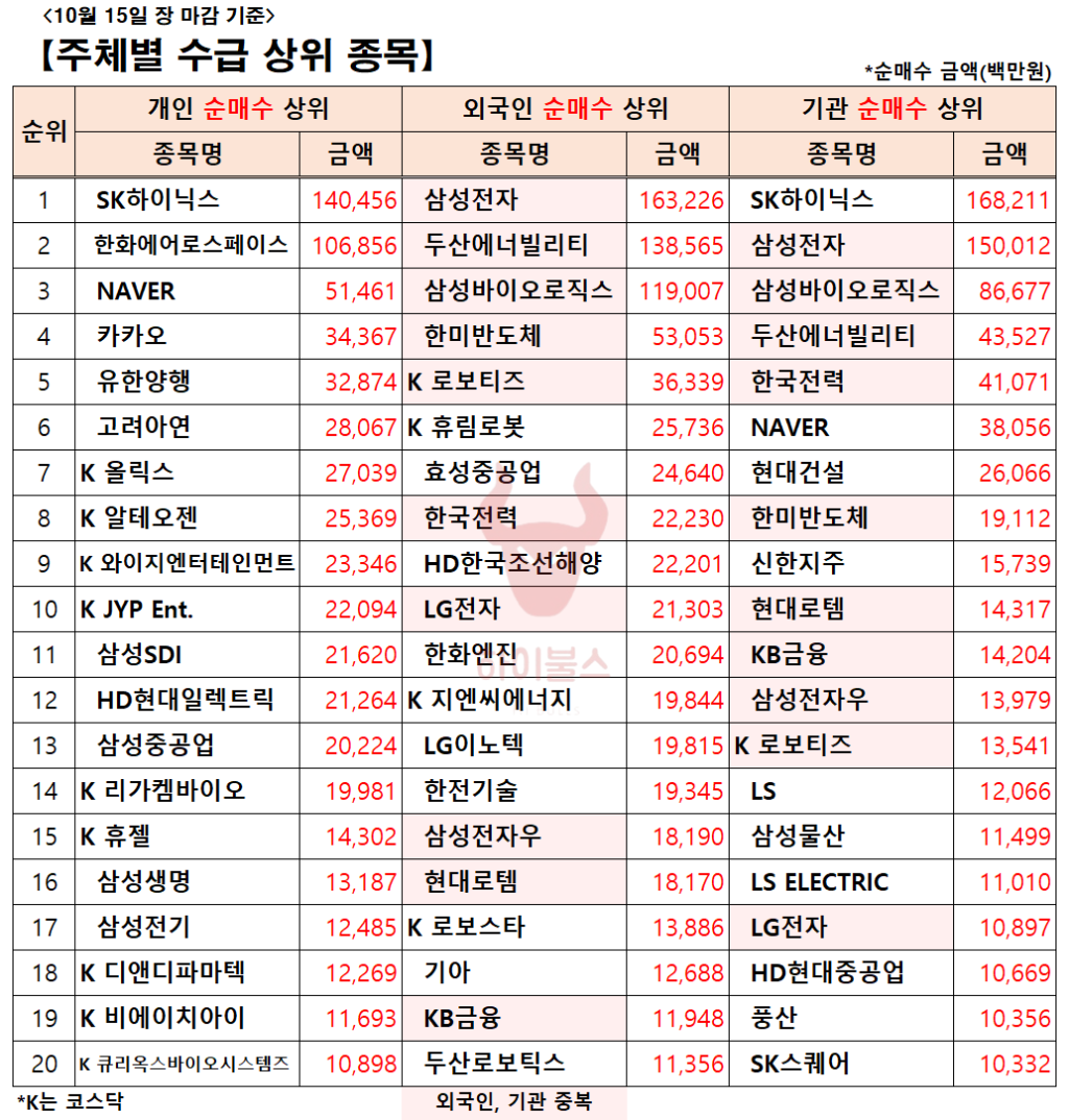 [10.15] 외국인/기관 순매수 상위 종목(AI 랠리)