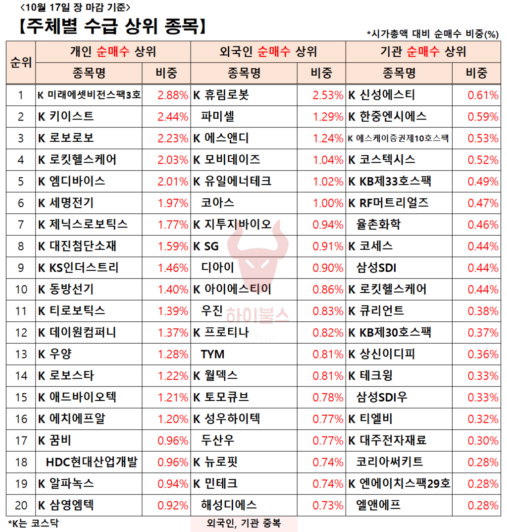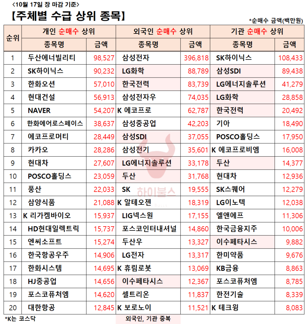[10.17] 외국인/기관 순매수 상위 종목(AI 랠리 + ESS)