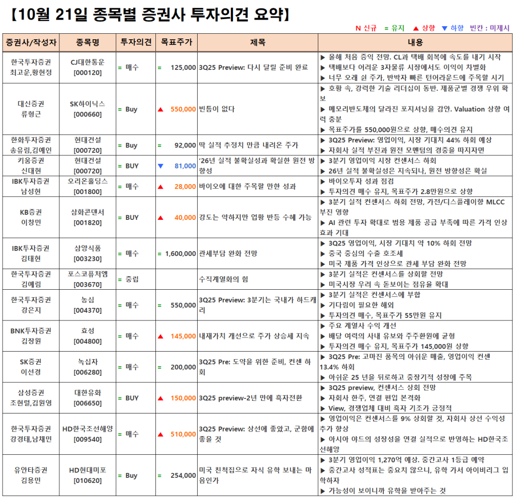 [10.21] 종목별 증권사 투자의견 요약