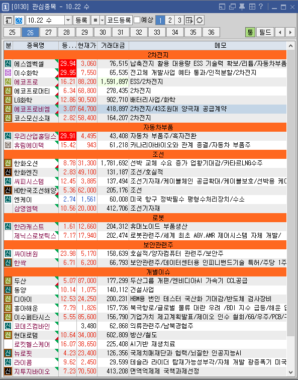 25년 10월 23일(목) 상위트레이더 관심종목+[2차전지/자동차부품/조선/로봇/보안] 주도주 재료 정리 + 포트폴리오 대응전략