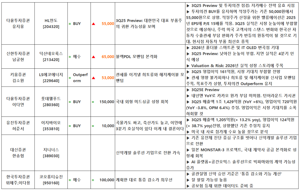 2025년 3분기 실적 특징주(10월 21일 기준)