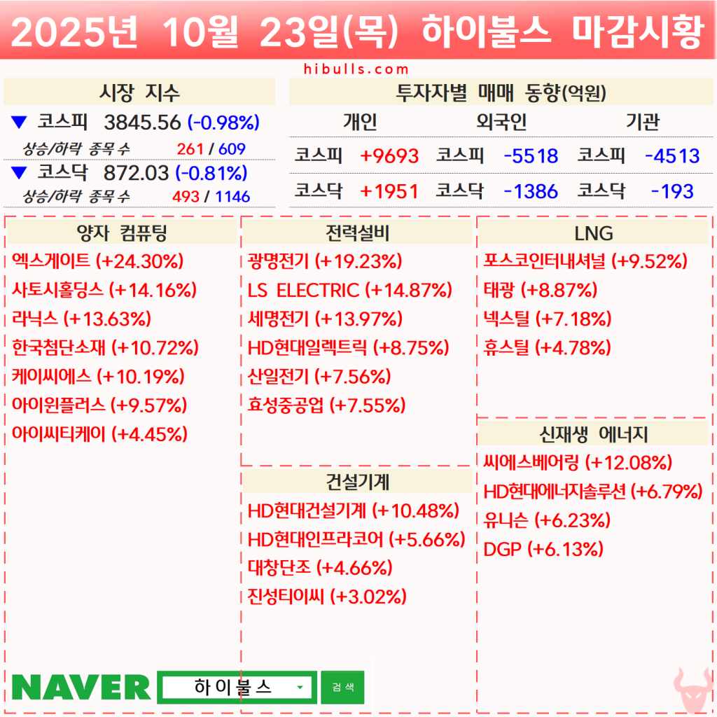 [10.23] 외국인/기관 순매수 상위 종목(AI 랠리, 소비재, LNG)