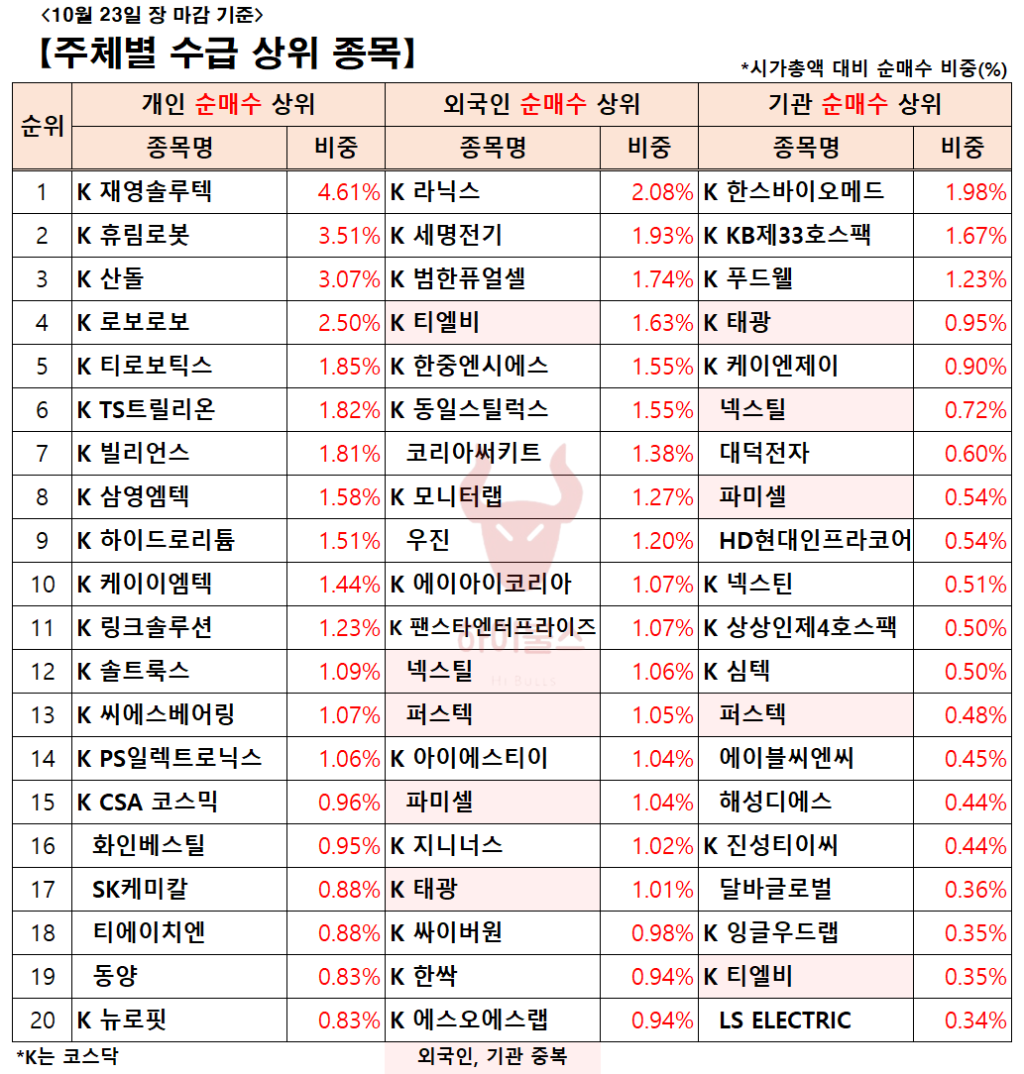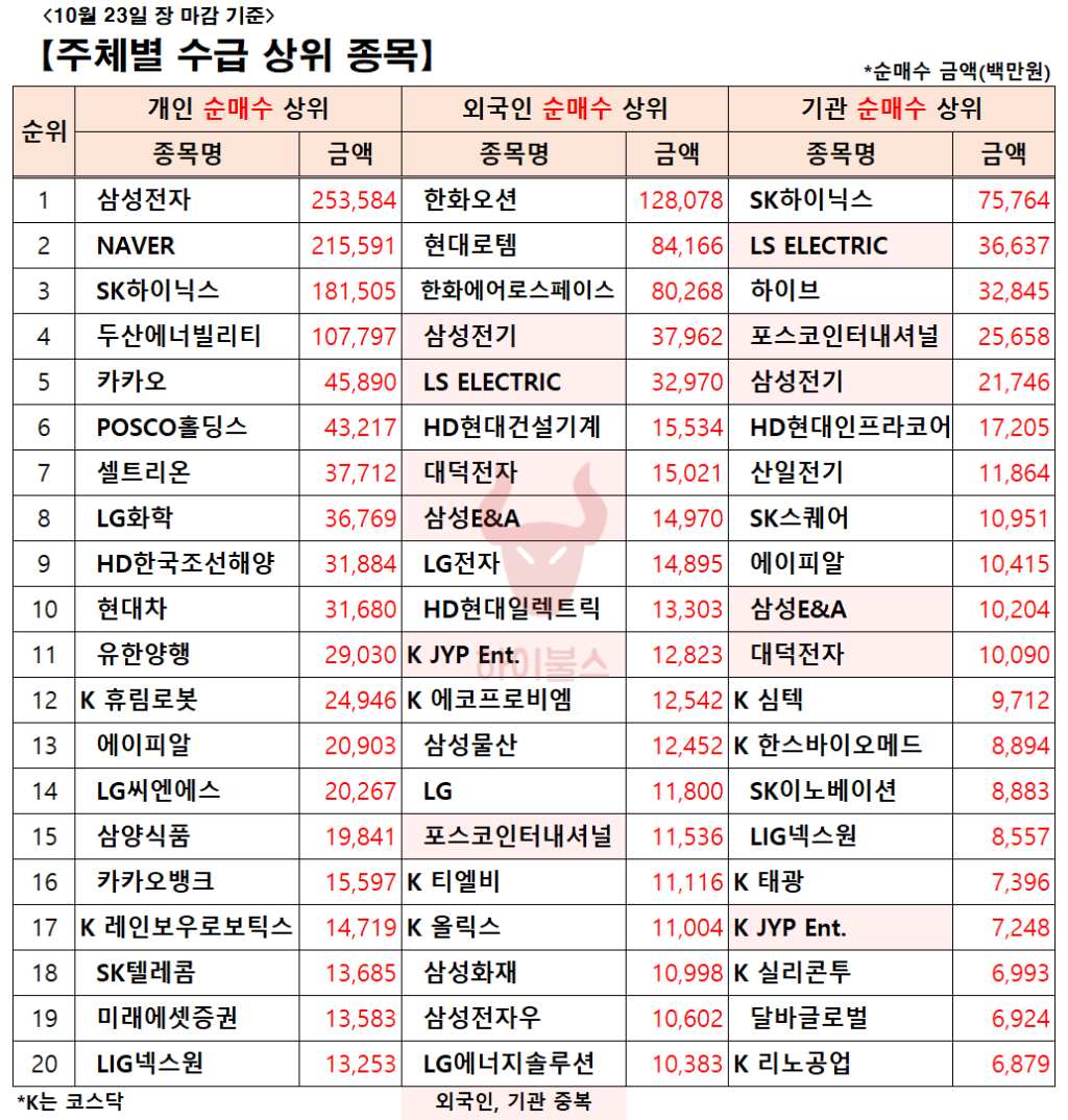 [10.23] 외국인/기관 순매수 상위 종목(AI 랠리, 소비재, LNG)