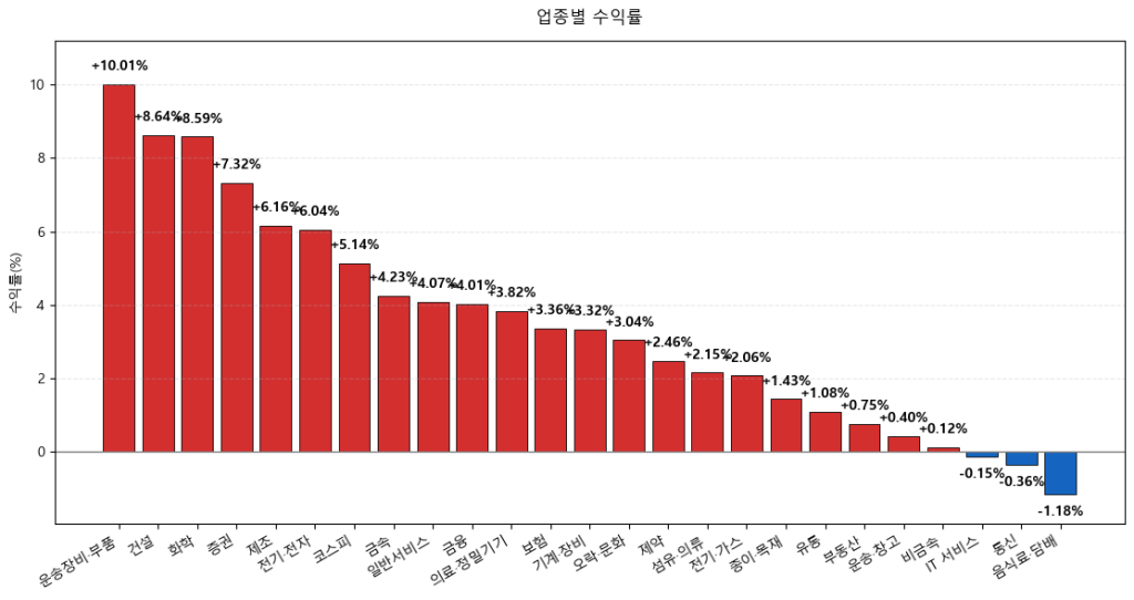 업종별로는 운송장비/부품(+10.01%), 건설(+8.64%), 화학(+8.59%), 증권(+7.32%), 제조(+6.16%), 전기/전자(+6.04%) 등이 강세를 보인 반면, 음식료/담배(-1.18%), 통신(-0.36%), IT서비스(-0.15%) 등이 부진한 흐름