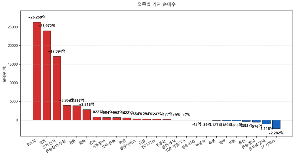 기관은 코스피를 약 +2조6천억 가량 순매수한 가운데 제조(+23,972억), 전기/전자(+17,094억), 운송장비/부품(+3,952억), 금융(+3,897억), 화학(+2,818억) 등을 순매수한 반면, IT서비스(-2,282억), 음식료/담배(-1,118억), 운송/창고(-574억), 통신(-353억) 등을 순매도