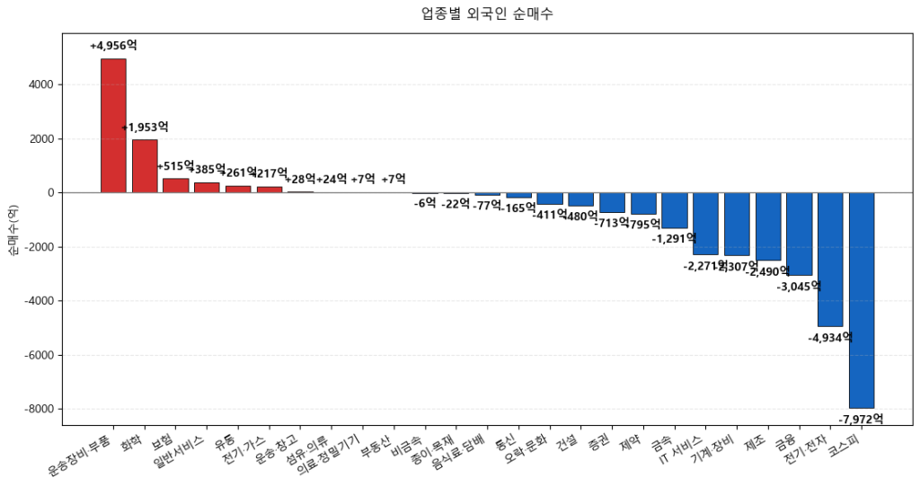 외국인은 코스피를 -7,932억원 순매도한 가운데, 운송장비/부품(+4,956억), 화학(+1,953억), 보험(+515억)을 순매수한 반면, 전기/전자(-4,934억), 금융(-3,045억), 제조(-2,490억), 기계/장비(-2,307억), IT서비스(-2,271억) 등을 순매도