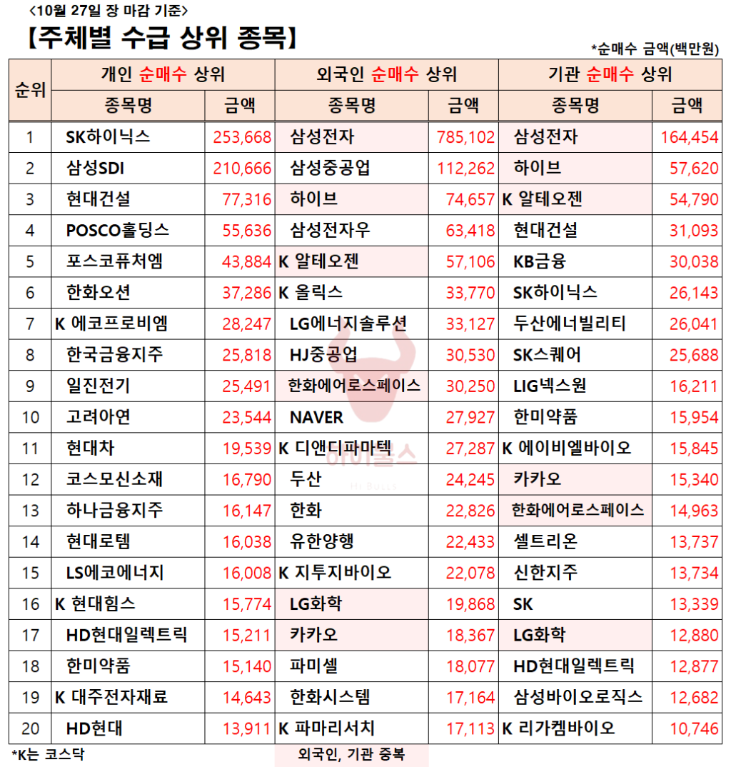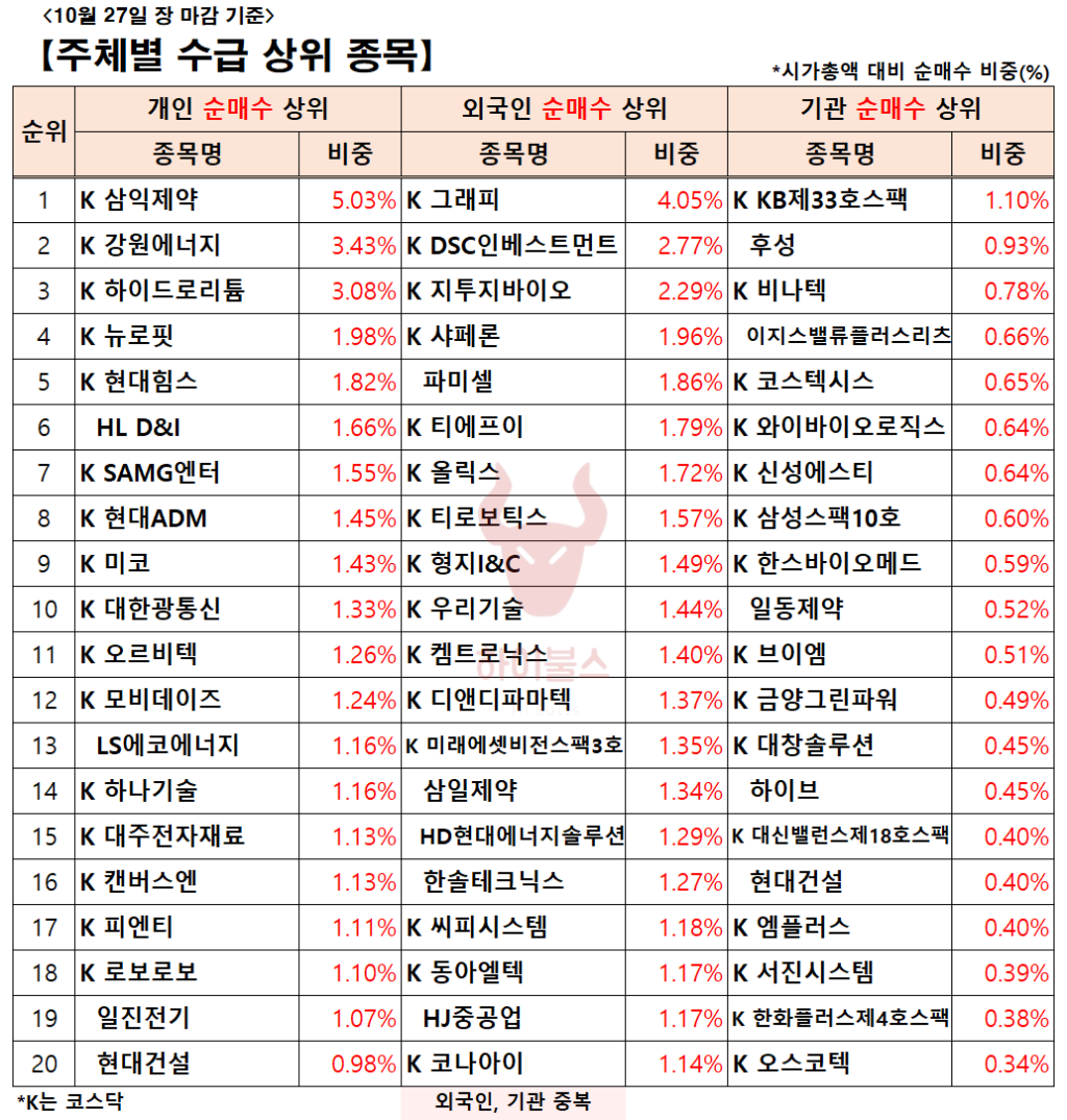 [10.27] 외국인/기관 순매수 상위 종목(AI 랠리 계속, 제약·바이오)