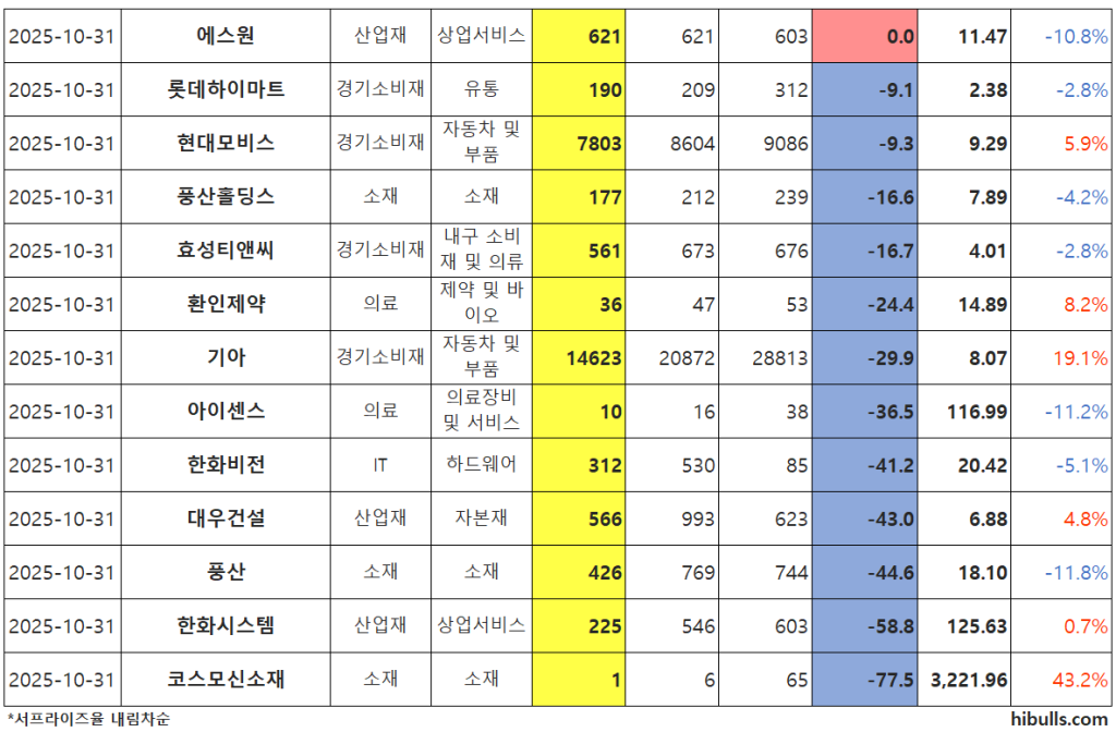 실적 쇼크 : 풍산홀딩스, 효성티앤씨, 환인제약, 기아, 아이센스, 한화비전, 대우건설, 풍산, 한화시스템, 코스모신소재