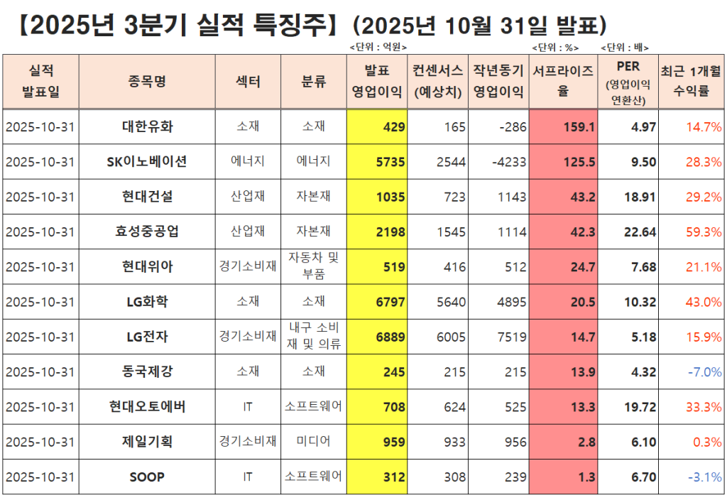 실적 서프라이즈 : 대한유화, SK이노베이션, 현대건설, 효성중공업, 현대위아, LG화학, LG전자