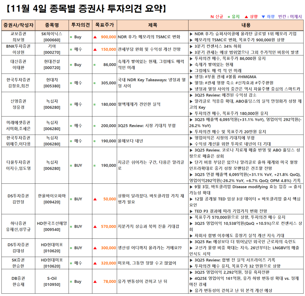 [11.03] 외국인/기관 순매수 상위 종목(AI 랠리 계속, 제약·바이오)