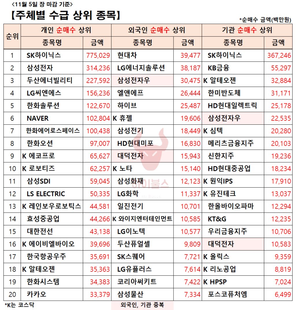 [11.03] 외국인/기관 순매수 상위 종목(AI 랠리 계속, 제약·바이오)