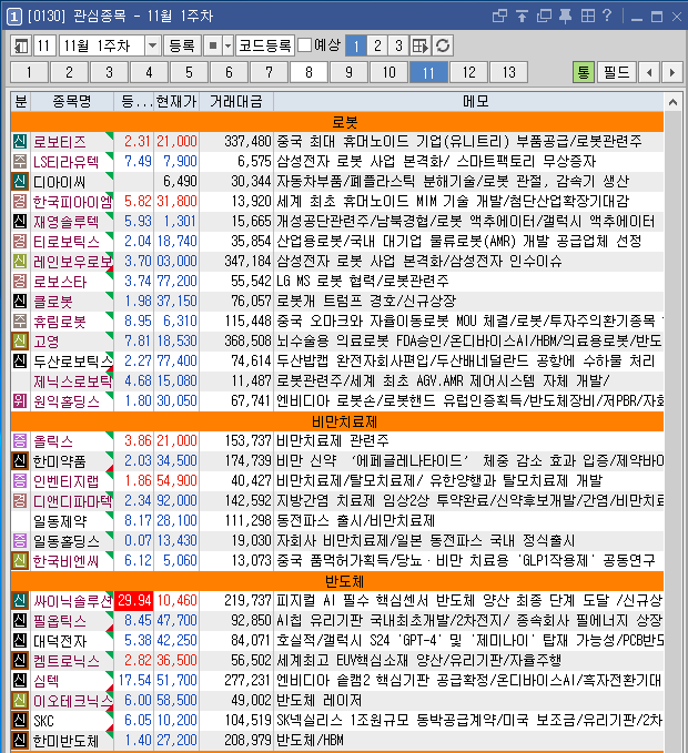 25년 11월 6일(목) 상위트레이더 관심종목+[바이오/로봇/남북경협/반도체 등] 주도주 재료 정리 + 포트폴리오 대응전략