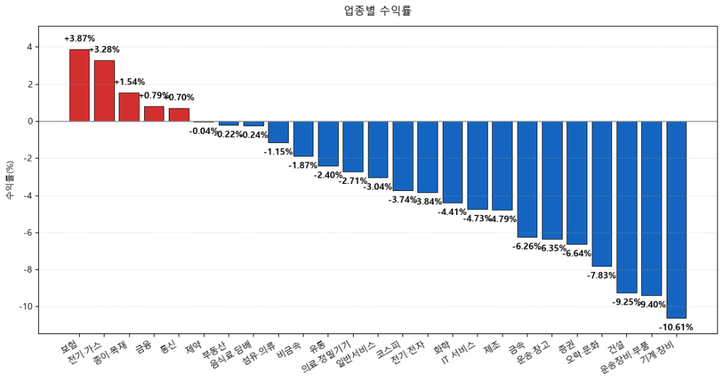 업종별로 보험(+3.87%), 전기/가스(+3.28%), 종이/목재(+1.54%), 금융(+0.79%), 통신(+0.70%) 등이 강세를 보인 반면, 기계/장비(-10.61%), 운송장비/부품(-9.40%), 건설(-9.25%), 오락/문화(-7.83%) 등은 부진