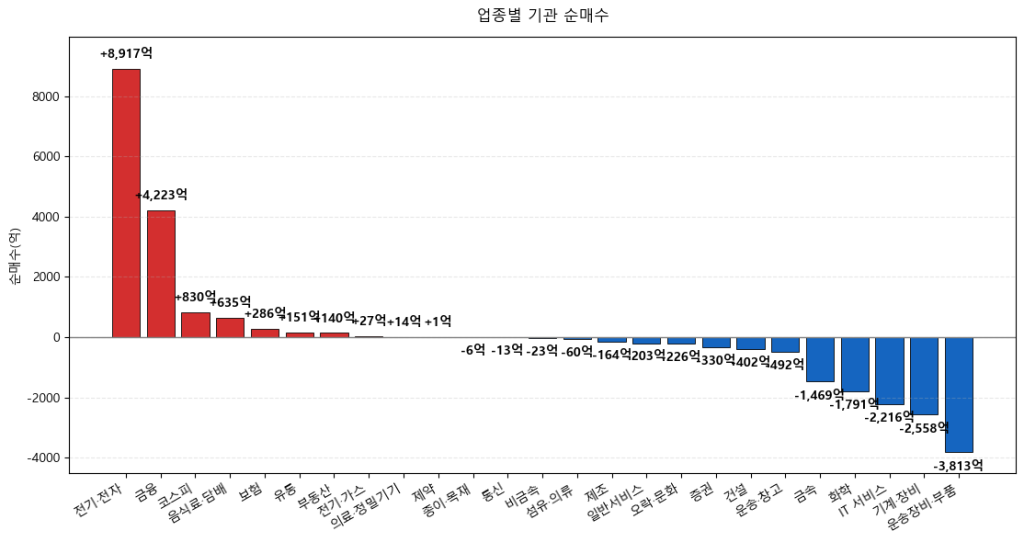 기관은 코스피를 약 +830억원 순매수한 가운데 전기/전자(+8,917억), 금융(+4,223억) 등을 순매수한 반면, 운송장비/부품(-3,813억), 기계/장비(-2,558억), IT서비스(-2,216억), 화학(-1,791억), 금속(-1,469억) 등을 매도