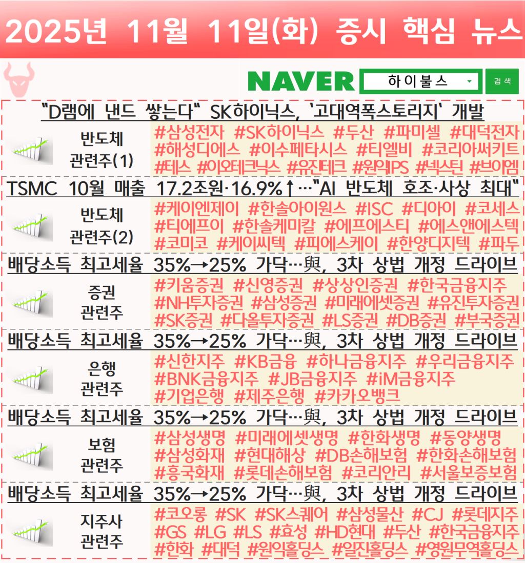 반도체 관련주, 증권 관련주, 은행 관련주, 보험 관련주, 지주사 관련주, 상법 개정 관련주, 배당소득 분리과세 관련주