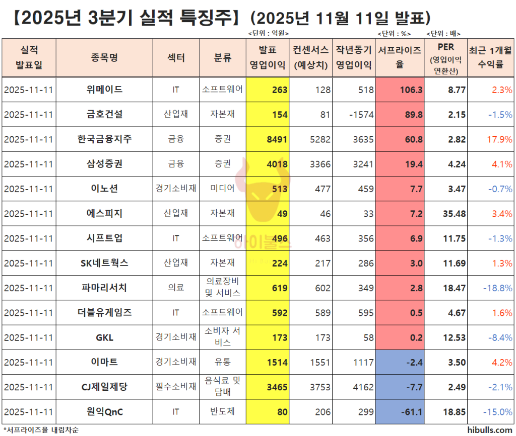 실적 서프라이즈 : 위메이드, 금호건설, 한국금융지주, 삼성증권
