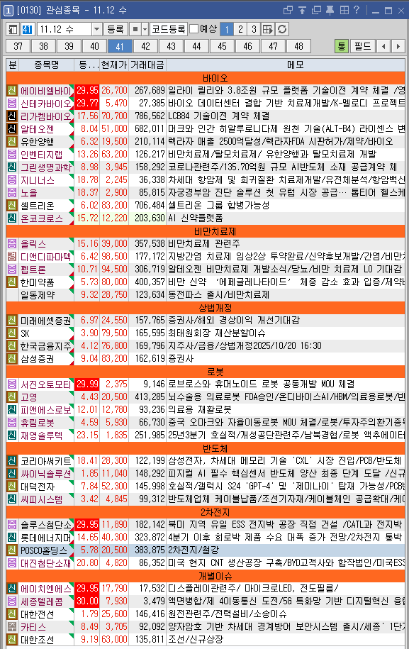 25년 11월 13일(목) 상위트레이더 관심종목+[바이오/비만치료제/상법개정/반도체/로봇 등] 주도주 재료 정리 + 포트폴리오 대응전략