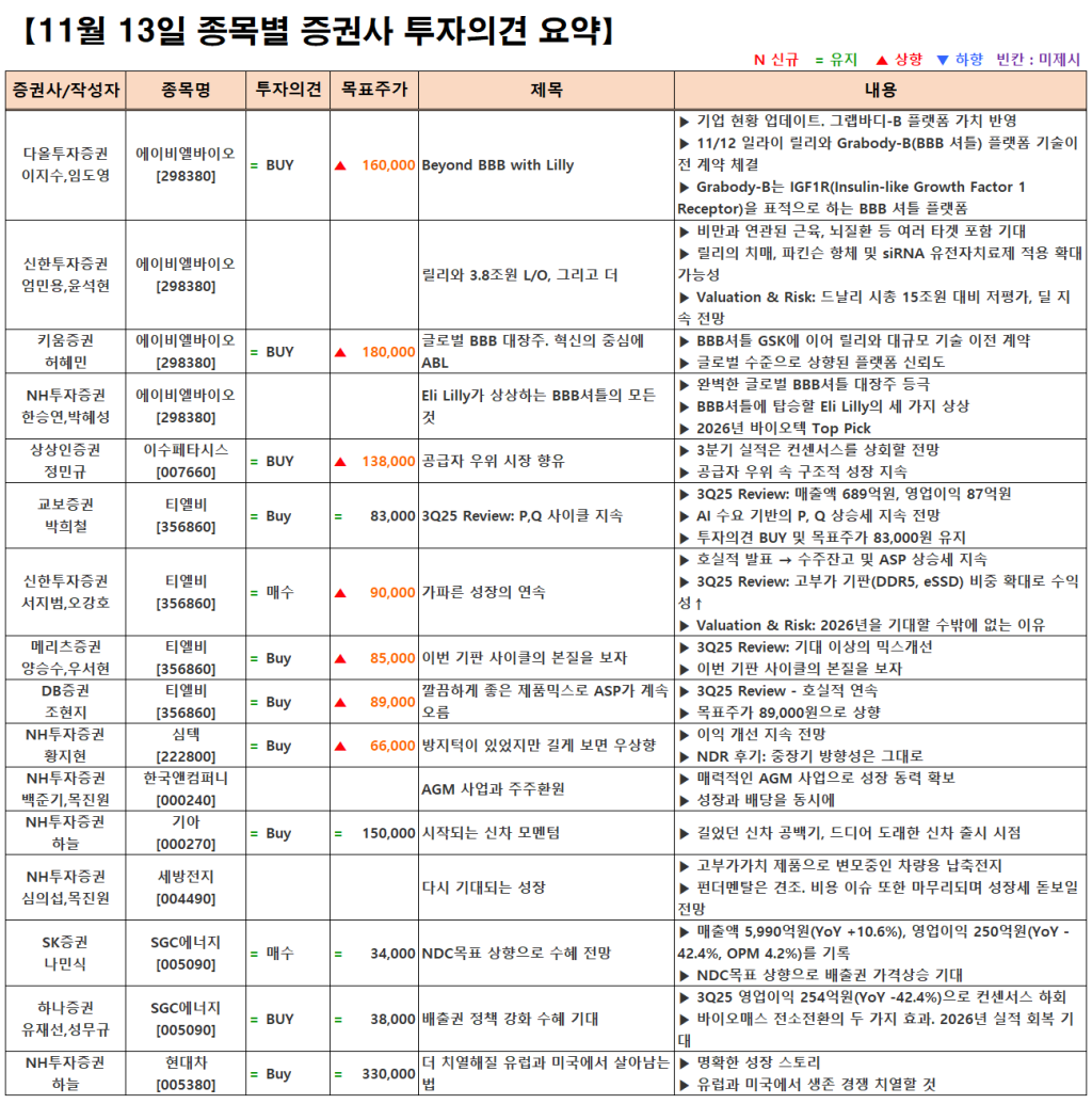 [11.13] 종목별 증권사 투자의견 요약
