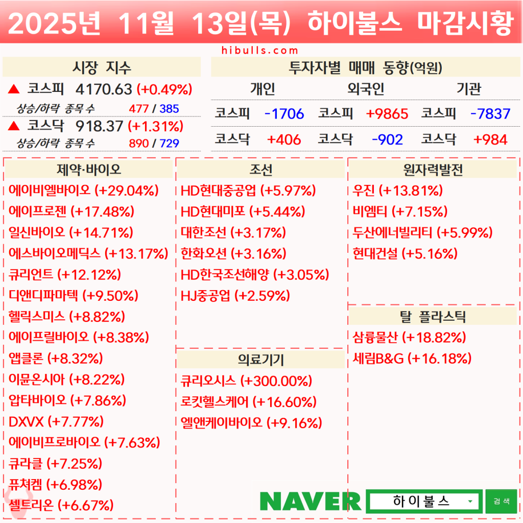 [11.13] 증시 마감시황 및 오늘의 특징주