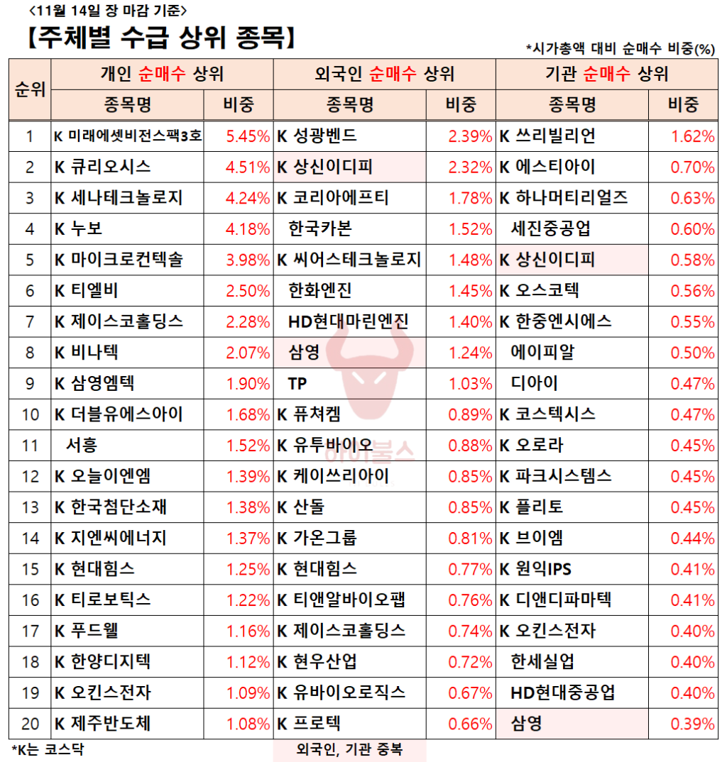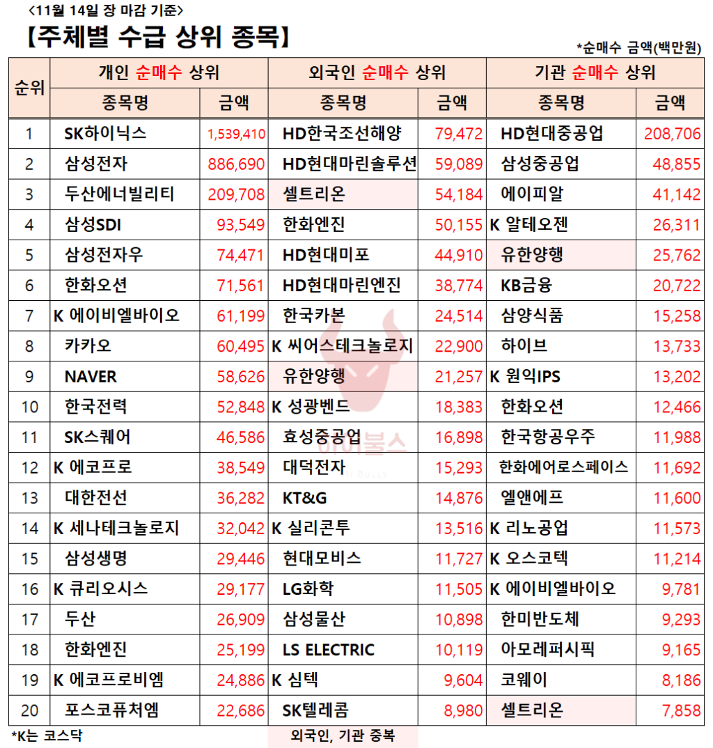 [11.14] 외국인/기관 순매수 상위 종목(실적, 조선, 제약·바이오)