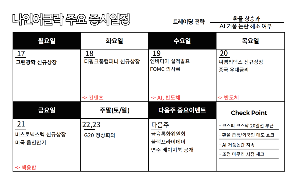 안녕하세요 나인어클락입니다. 11월 3주차 주간일정, 상위트레이더 선정 섹터별 대장종목, 포트폴리오 대응 전략을 공유드립니다.