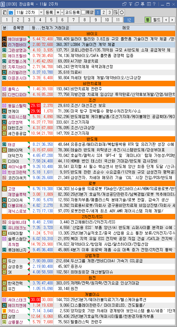 25년 11월 14일(금) 상위트레이더 관심종목+[바이오/비만치료제/2차전지/로봇/원전 등] 주도주 재료 정리 + 포트폴리오 대응전략