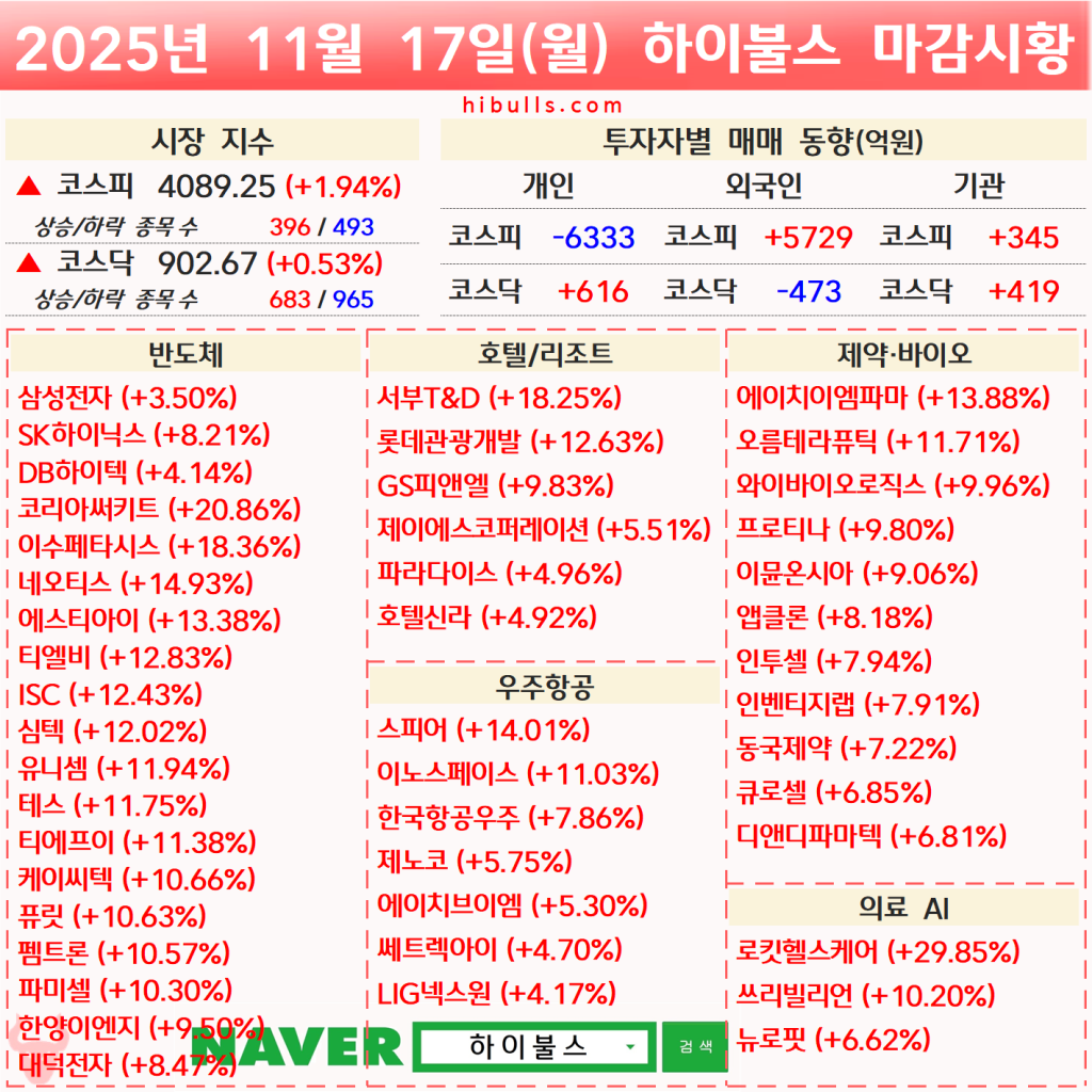 [11.17] 외국인/기관 순매수 상위 종목(AI 랠리, 인바운드 소비재, 제약·바이오)