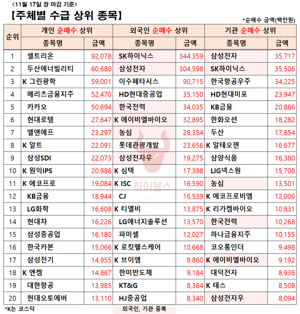[11.17] 외국인/기관 순매수 상위 종목(AI 랠리, 인바운드 소비재, 제약·바이오)