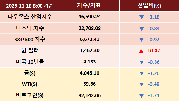 전일 미국 증시는 워렌 버핏의 알파벳(+3.1%) 지분 매입 소식에도 연준 위원들의 12월 인하를 둘러싼 엇갈린 발언 및 주요 기관 투자자들의 3분기 엔비디아 지분 축소 및 실적 경계 심리 등으로 하락 마감