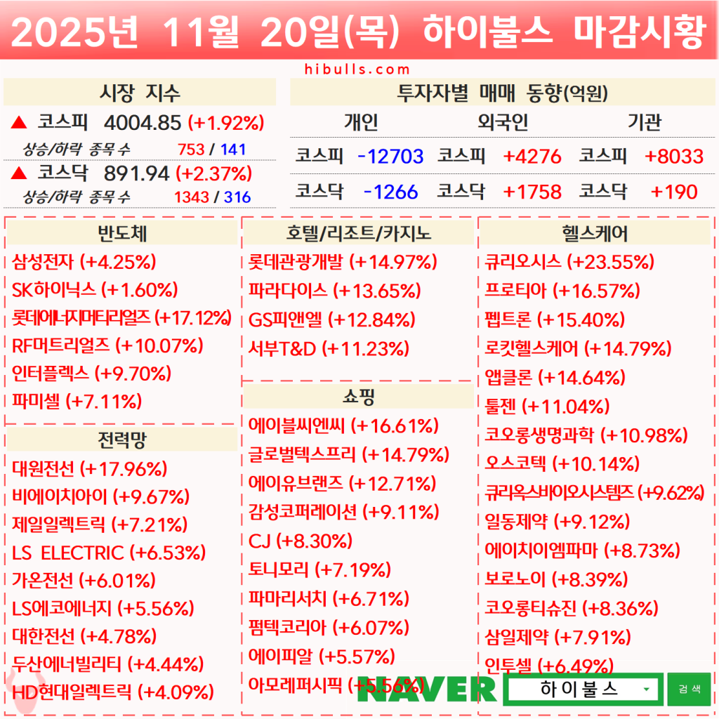 [11.17] 외국인/기관 순매수 상위 종목(AI 랠리, 인바운드 소비재, 제약·바이오)