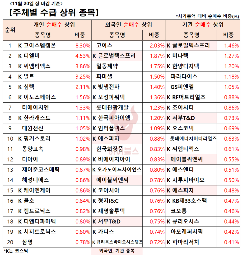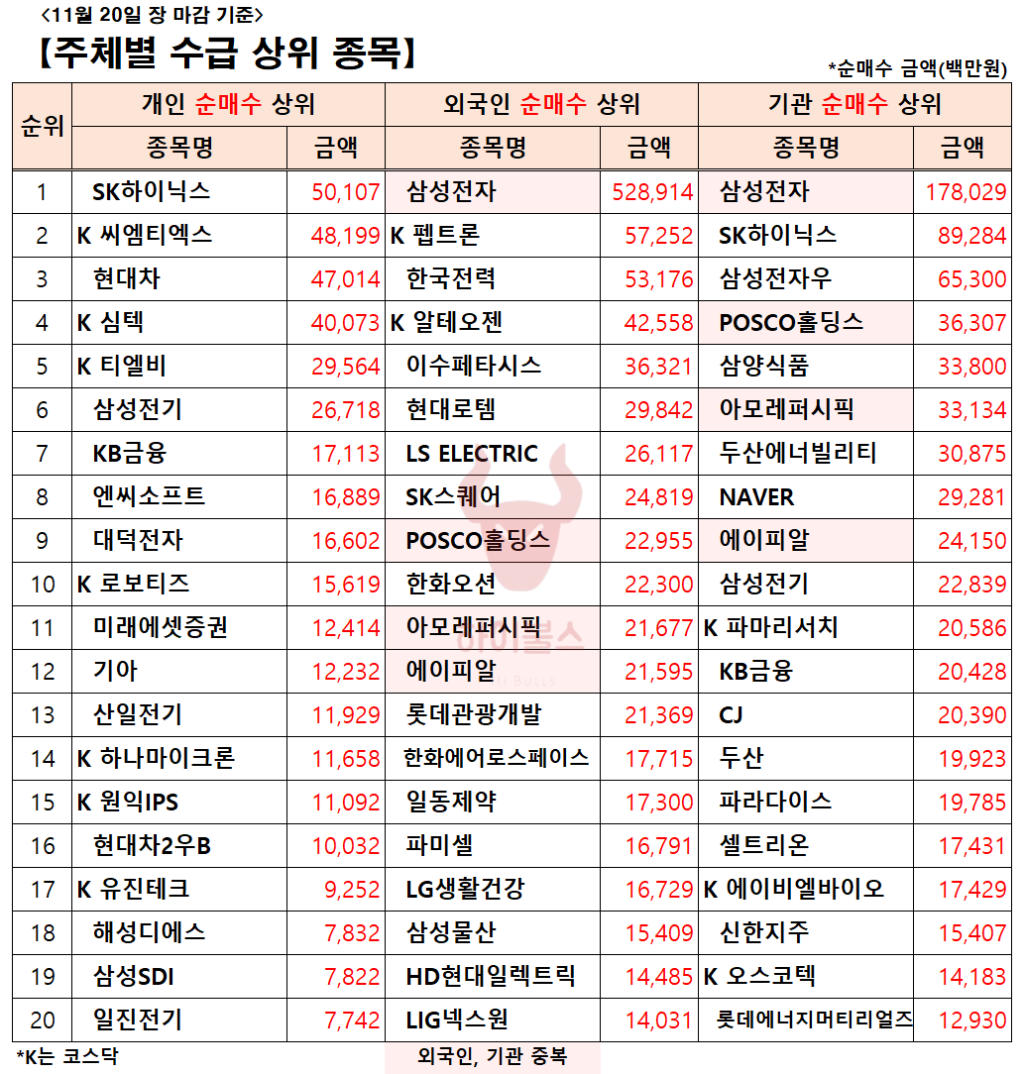 [11.20] 외국인/기관 순매수 상위 종목(인바운드 소비재, 제약·바이오)