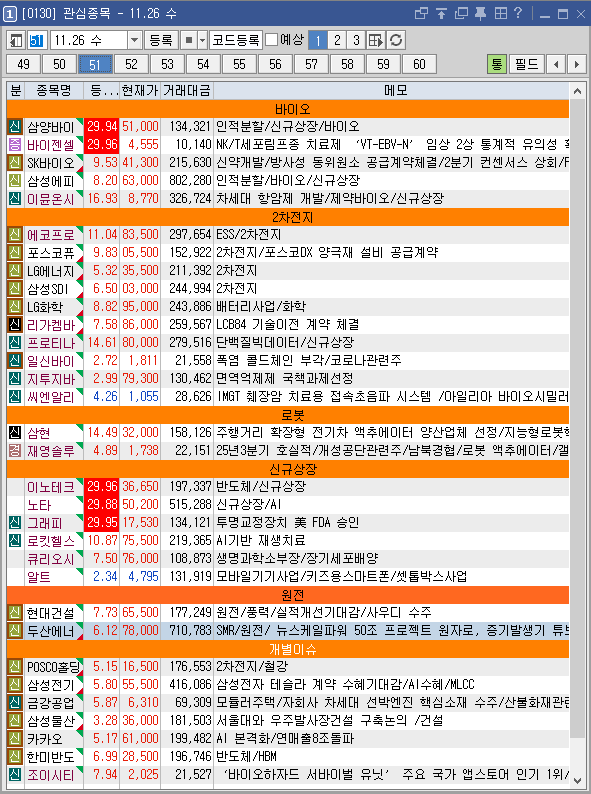25년 11월 27일(목) 상위트레이더 관심종목+[바이오/2차전지/로봇/신규상장 등] 주도주 재료 정리 + 포트폴리오 대응전략