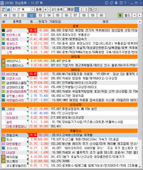25년 11월 28일(금) 상위트레이더 관심종목+[로봇/반도체/바이오/신규상장등] 주도주 재료 정리 + 포트폴리오 대응전략