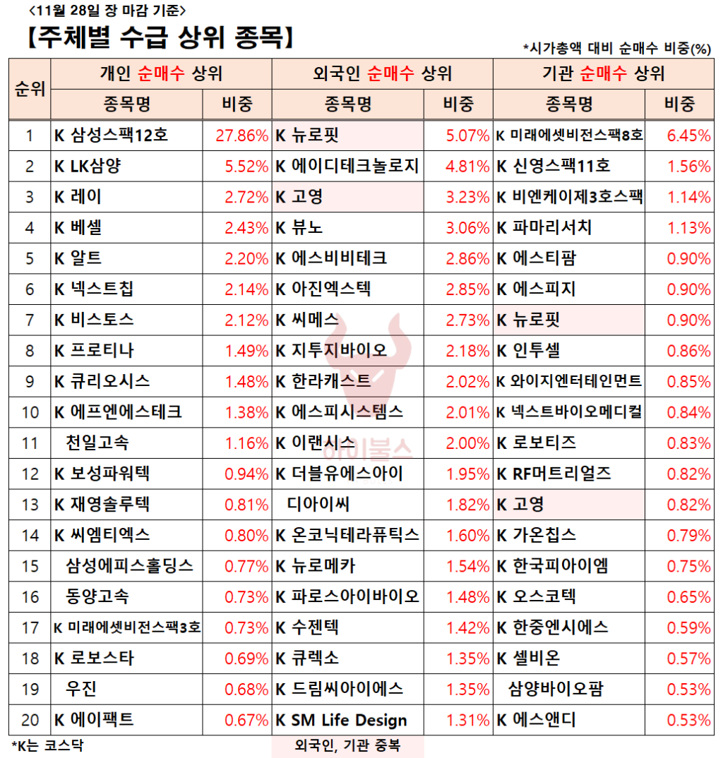 [11.28] 외국인/기관 순매수 상위 종목(헬스케어, 로봇)