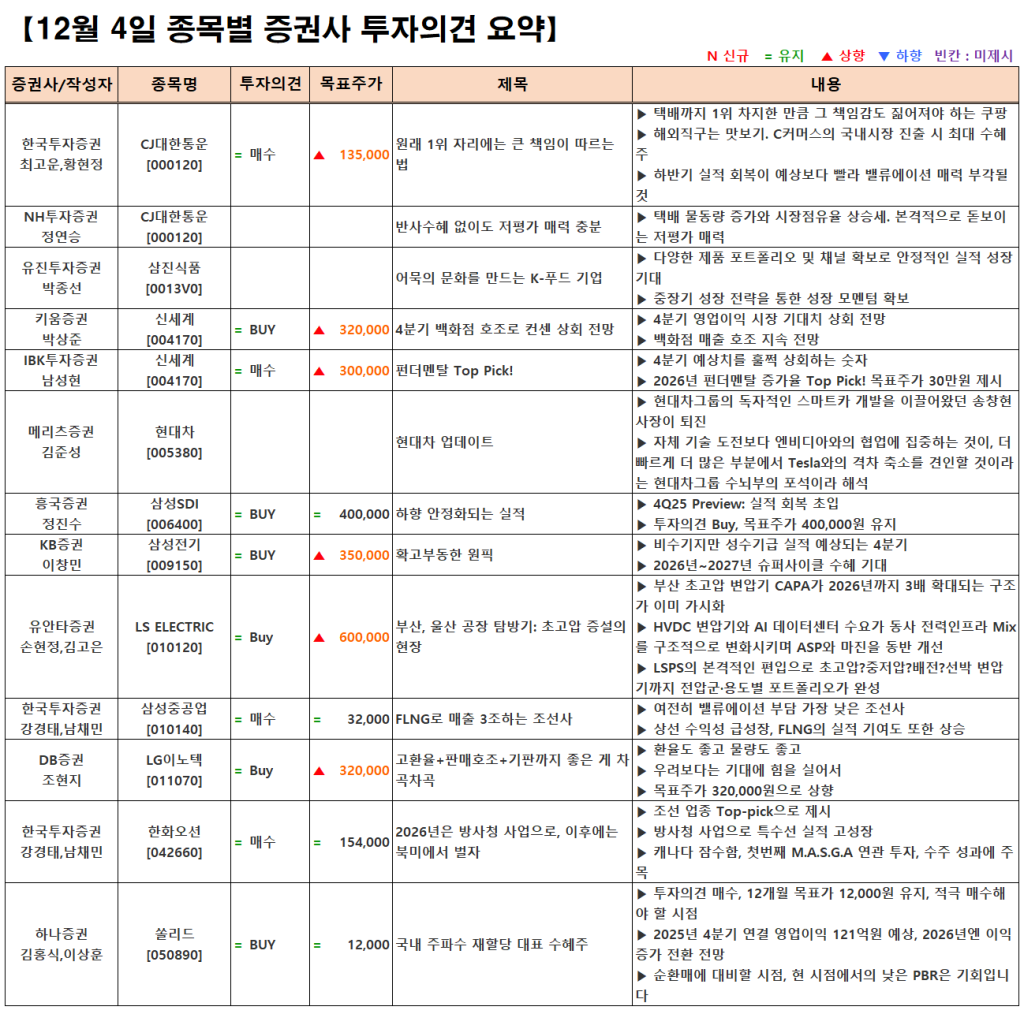 [12.04] 종목별 증권사 투자의견 요약