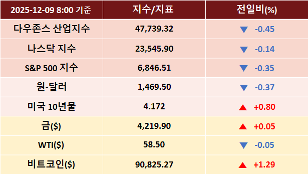 전일 미국 증시는 트럼프 정부의 엔비디아(+1.72%) H200 대중 수출 허용 소식 등에 따른 반도체주 강세에도 12월 FOMC 경계심리 속 미국채 10년물 금리가 4.1% 레벨까지 상승한 여파로 3대 지수 하락 마감