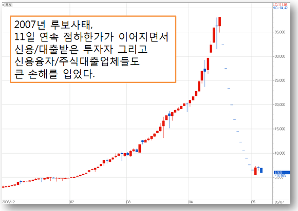 이런 시장 상황을 보다가, 이번 하한가 사태 속 종목들의 차트를 보다 보면 문득 2007년에 발생했던 ‘루보’ 사태가 떠올랐습니다.